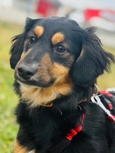 Hallo, ich bin Derrick! Aktuell bin ich etwa 6 Monate jung, klein bis mittelgroß und man munkelt, dass in mir ein Dackelmischling steckt – kurze Beine, großer Charme, ihr wisst schon… Naja und rein optisch sind die Dackelgene auch nicht ganz von der Hand zu weisen, denn ich bin schon recht hübsch anzusehen, mit meinem seidig- flauschigen Fell in mittellang und schwarz mit braunen Abzeichen… dazu diese süüüßen Schlappohren und ein zuckersüßer Blick aus strahlend braunen Augen… Ich bin fröhlich, aufgeschlossen, verspielt, suuuuper freundlich und menschenbezogen… Ich liebe es, dabei zu sein und Aufmerksamkeit zu bekommen – Streicheleinheiten finde ich übrigens großartig… Außerdem bin ich ziemlich schlau… Halsband, Geschirr und Leine? Habe ich an einem einzigen Tag verstanden. Lernkurve: steil!! Okay, ich gebe zu… manchmal passieren mir noch kleine Pipi-Unfälle… Aber hey – ich bin ja auch noch ein Welpe und übe fleißig! Mit den anderen Hunden verstehe ich mich prima, typisch für ein Hundekind möchte ich naaaatürlich den ganzen Tag Spaß haben, was Leckeres zu futtern und mal gaaanz kurz chillen…